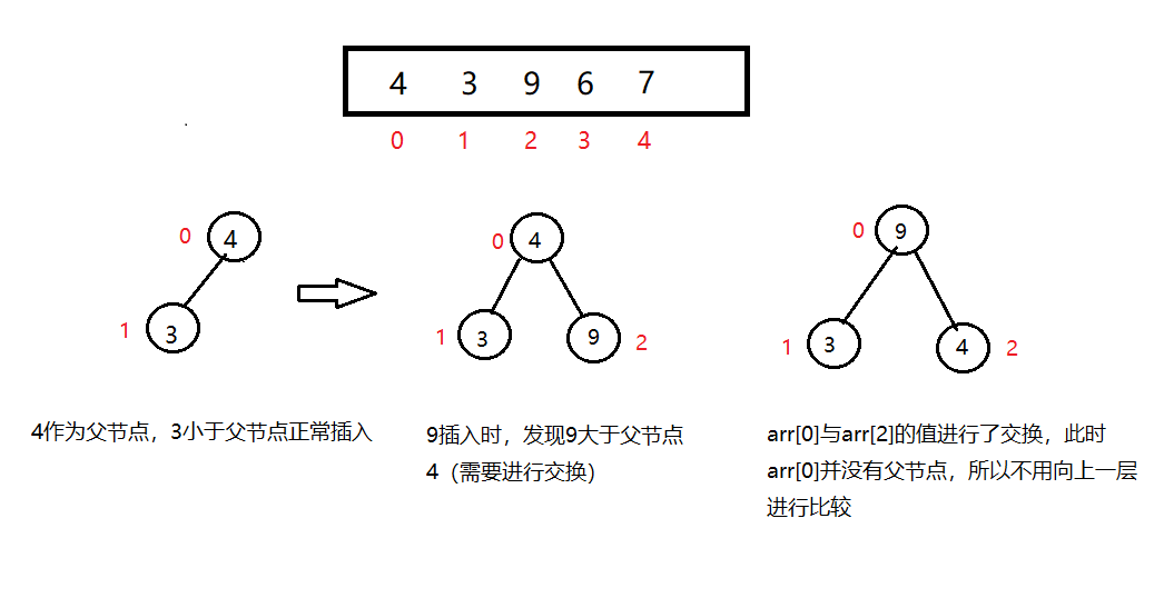 如果大于父节点则与父节点交换,并在父节点上进行同样的比较操作(与祖父节点比较),直到堆顶(arr[0])或者小于其父节点则完成插入操作