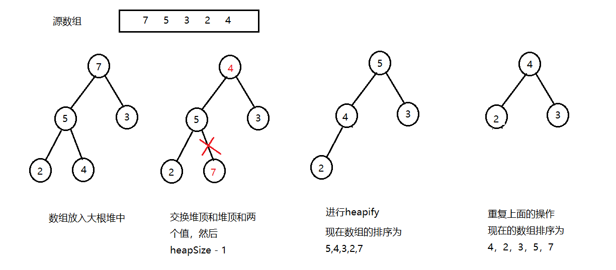 把数放进大根堆中,然后把堆顶和堆底的值进行交换(这样最大值在最后辣)。这时候heapSize就有用了,heapSize-1 这样最后一个元素就不会在动了,然后用heapify把堆调整回一个大根堆,继续进行上面的操作直至heapSize == 0 即可。