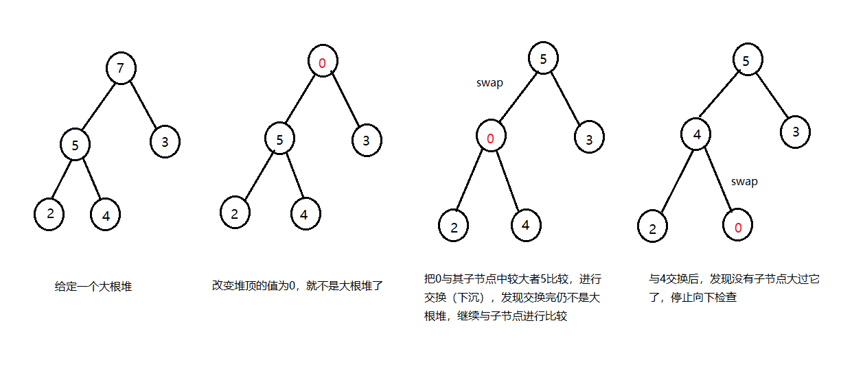 当改变的节点小于子节点中较大的一个,则进行”下沉”,下沉是指把左右子树中的较大者与当前节点进行比较,若大于当前节点则两者交换,并且进入下一层进行检查
