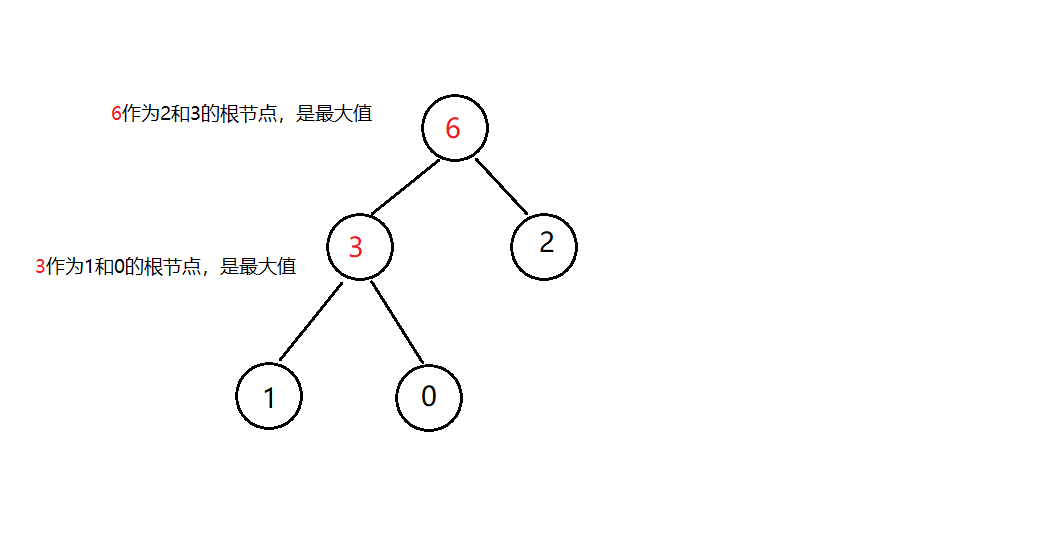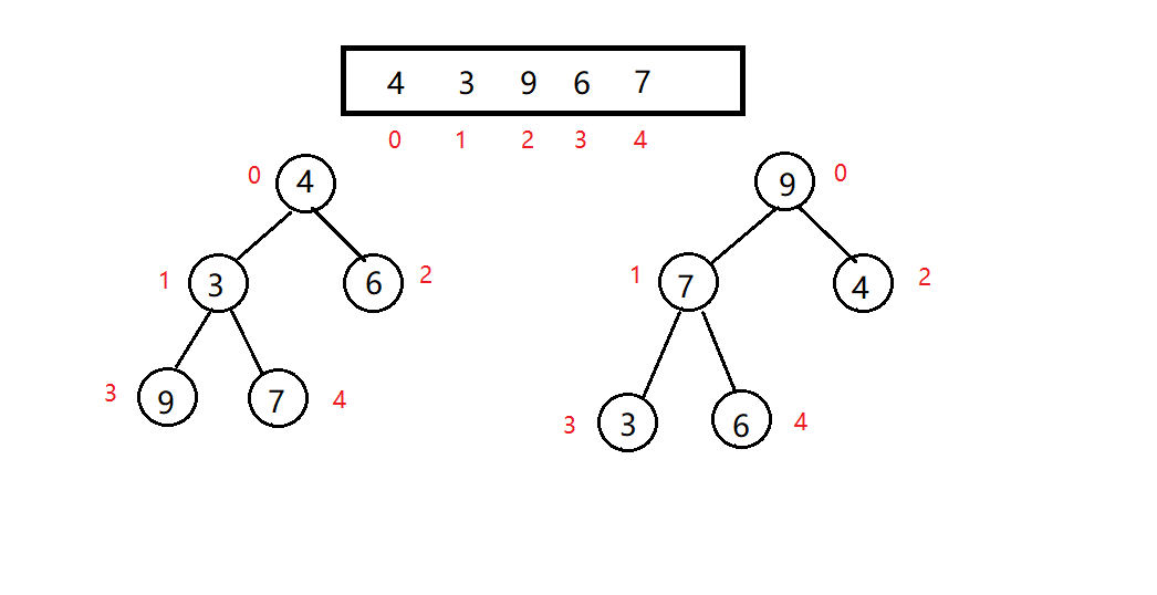 左边为完全二叉树形式,右边为大根堆形式,红色的数字代表对应的下标