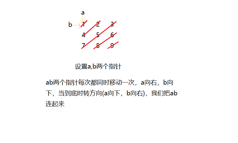 由题目可以看出,之字型输出矩阵,就是从上到下或者从下到上的输出一条斜线,那么我们只需要写一个方法输出斜线,然后再根据边界进行循环即可。