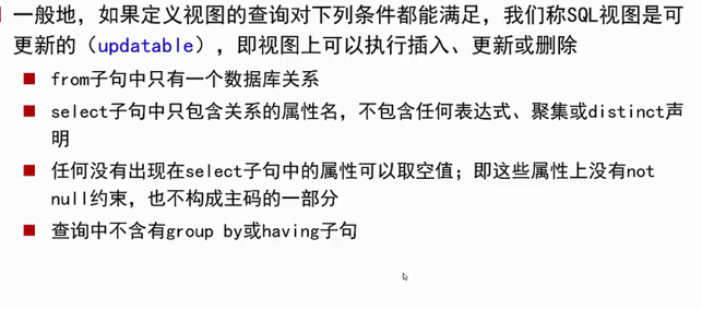 • SQL-99对视图的更新有更复杂的规则,故不讨论。