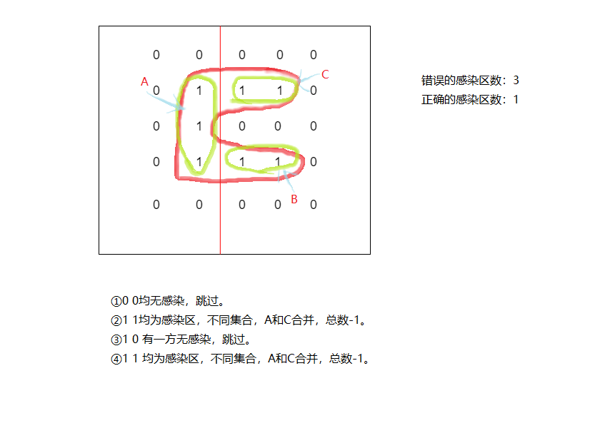 - 还有的情况兄弟萌可以自己画一下图(若有两个感染区,两次相邻,我们只会减去1个)