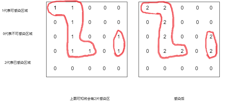 - 有一种超级病毒,能在特定区域传播,这里我们用1代表可感染区域,把2代表已感染区域,把0代表不会感染的区域。我们把一个连在一起的感染区域称作一个感染区。